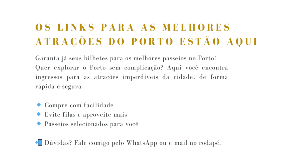 Subscreva e receba dicas e sugestões exclusivas. Um grupo exclusivo para planejar os seus passeios no Porto, ao lado de outras pessoas. Uma comunidade para trocar informações sobre o Porto. Uma ajuda para facilitar a sua vida na hora de criar um roteiro sozinha sem dor de cabeça, em que você possa explorar a cidade de uma maneira inesquecível. Você terá encontros de tira dúvida, troca de experiências e roteiros, networking, descontos exclusivos. Novidades em primeira mão. Ideal para quem vem passar um mês ou mais no Porto ou arredores.